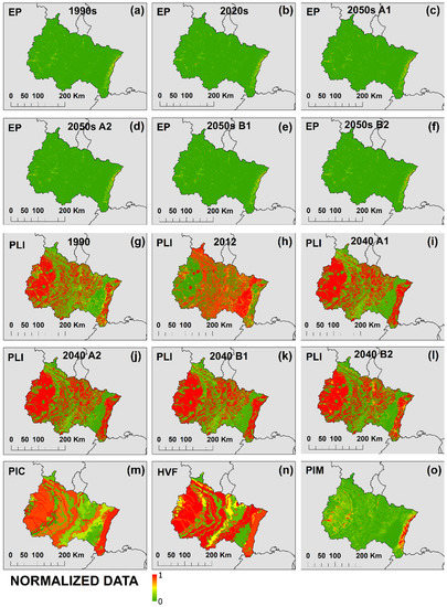 In order to obtain a homogeneous database, all datasets were normalized between 0 and 1. Thus, the effective precipitation (EF, for 1990s, 2020s, and four scenarios for 2050s), the pollution load index (PLI) (CLC1990, CLC2012, and HERCULES Projections 2040), the potential infiltration coefficient (PIC), the hydrogeological vulnerability factor (HVF), and the potential infiltration map (PIM) were normalized and processed in a unique scale. Data normalization was done in conformity with the standard formula (Equation (5)). In this way, the datasets are ready for risk mapping analysis and other various spatial interference.