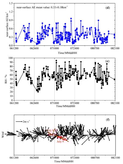 Based on the aforementioned methods of spectral analysis and profile inversion, the AE profiles up to 4 km altitude with a vertical grid of 200 m were derived from MAX-DOAS observations. Due to no substantial information for the AE above 2 km altitude [6], we only show the time series of hourly AE profiles below 2 km in Figure 3a,b and Supplementary Materials Figure S1. Besides higher AEs at lower altitudes, elevated AE layers are found frequently. The time series of AODs and AEs in the 0–50 m layer, integrated and extracted from the retrieved profiles respectively, are shown in Figure 3c,d. The average AOD and near-surface AE, i.e. 0.51 ± 0.26 and 0.33 ± 0.18 km−1, over the campaign period are slightly smaller than the levels at the nearby suburban site of Xingtai (AOD: 0.65, AE: 0.43 km−1 in May and June 2016) [50]. The time series of AODs and near-surface AEs present similar variation trends with a correlation coefficient of R = 0.78 (Figure 4a). The variations of AOD and near-surface AE present several enhancement events, such as during the period of 27 June–9 July, which can be used to indicate the pollution episodes. Both AODs and near-surface AEs are positively correlated with relative humidity (RH, Figure 3e and Figure 4b), implying an influence of the aerosol hygroscopicity on the AE. Linear regression analysis shows that the correlation coefficient between near-surface AEs and RHs (R = 0.42) is larger than that between AOD and RHs (R = 0.32) (Figure 4b). Surface in-situ measurements confirm that hygroscopic growth noticeably enhances the aerosol scattering coefficient at Raoyang, especially for conditions of high content of water-soluble secondary inorganic aerosols and fine particles [19,64]. The wind direction and speed have an important impact on the AE by transport of pollutants from different emission sources. For example, from the period of high AOD and near-surface AE (8 July) to the clean period (9 July), the RH stayed constantly around 60%, but the wind direction changed from the southeast (more pollution) to the WNW section (less pollution), with the average wind speed increasing from 1.56 m/s to 3.80 m/s (Figure 3f).