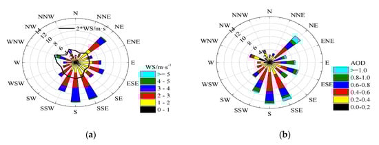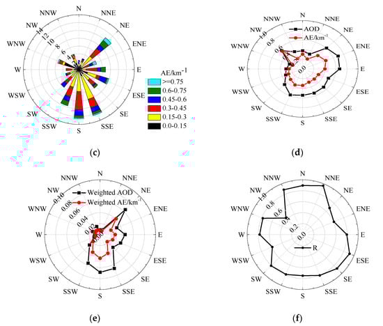 To further investigate the influence of the wind direction and speed, we present the corresponding roses (Figure 5) using the hourly data shown above (Figure 3). During the observation period, the frequent wind directions (WD) were in the sectors of S, SSE, NE, and SSW (Figure 5a). Hourly wind speeds (WS) larger than 5 m/s appeared in the WNW sector, and the average WS in all 16 WD sectors were between 1.6 m/s and 3.0 m/s. Among the 16 wind directions (Figure 5b,c), the highest frequencies of the largest (AOD > 1, AE > 0.75 km−1) and smallest (AOD < 0.2, AE < 0.15 km−1) values occurred in the sectors of NE and WNW, respectively. Both AODs and near-surface AEs varied strongly with wind direction (Figure 5d). In the NE to SSW sectors, the AOD (near-surface AE) means are high and close to each other, possibly connected with the cities distributed in these directions. Similarly, high AOD (near-surface AE) is also found in the NW sector, where Baoding city is located upstream (Figure 1b). Furthermore, to analyze the influences of pollutant transport, we calculated the weighted AOD and near-surface AE by the occurrence frequency of WD (Figure 5e). The highest weighted AOD and near-surface AE are concentrated on the directions of NE, SSE, S, and SSW, indicating that pollutants from the northeast and south, where cities with high source emissions are distributed [52], contribute significantly to the AE level at the Raoyang station. Figure 5f also shows the change of correlation coefficient between AOD and near-surface AE with the wind direction. Most of correlation coefficients are near to or higher than 0.8. Excluding the NW, WSW, and ENE cases for the reason of few samples, weaker correlation in the NE may be caused by the heterogeneous distribution of AE in the vertical profiles. Therefore, the wind field, coupled with inhomogeneous spatio-temporal emission sources, could significantly impact the vertical distribution of the AE.