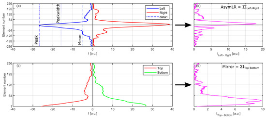 Schematic of the complementary metal-oxide-semiconductor (CMOS) array data and parameters derived from a 3 µm polystyrene latex sphere particle. (a) Raw intensity data from the left and right CMOS arrays. Array peak, mean and peakwidth values are indicated by dashed, dot-dashed and dotted lines, respectively. Horizontal black line indicates array midpoint; (b) Modulus of the element by element subtraction of the left and right arrays. The resultant sum is the AsymLR parameter; (c) Raw intensity of the top and bottom sections of the left CMOS array, starting from the middle of the array outwards; (d) Modulus of the element by element subtraction of the top and bottom sections of the left CMOS array. The resultant sum is the Mirror parameter.