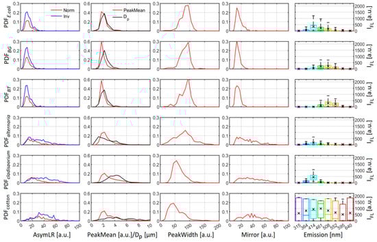 ACS training data overview. Shown are the probability density functions of the CMOS parameters (columns 1 to 4) and box and whisker plots of the autofluorescent spectrum (row 5) for E.coli (top row); Bacillus atrophaeus (BG, 2nd row); Bacillus thuringensis (BT, 3rd row); Altenaria (4th row); Cladisporium (5th row); and cotton fibres (6th row). Whiskers denote 5th and 95th percentiles. Cross denotes mean value.