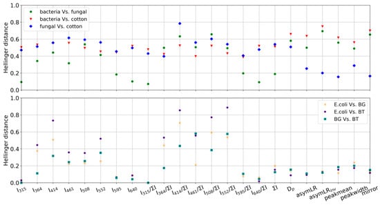 ACS training data Hellinger distances for each parameter. Top panel: inter-class comparison of the broad classes. Bottom panel: intra-class comparison of the three bacterial samples. The Hellinger distance metric quantifies the similarity between two probability distributions where values towards zero indicate similarity between distributions and a value of 1 indicated dissimilarity.