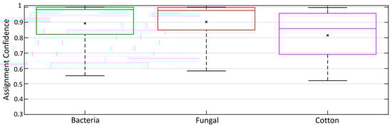 Box and whisker plots of the GBA model prediction class assignment confidence applied to the University Place ambient MBS data. Whiskers denote the 5th and 95th percentiles. Cross denotes mean value.