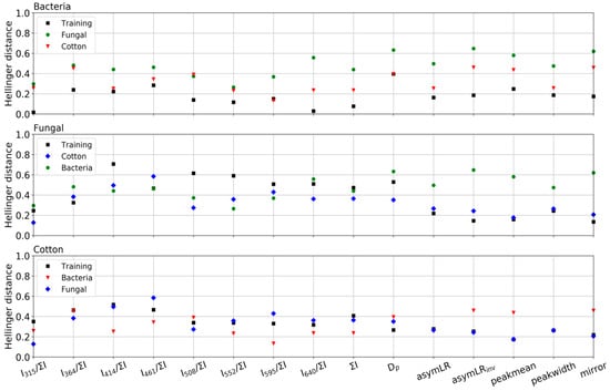 Comparison of inter-class similarity. Hellinger distances for each parameter comparing the ambient classes to one another and also to their respective ACS training data. Top: Bacteria-like; Middle: Fungal-like; Bottom: Cotton-like. Ambient data is selected using an assignment probability of p > 0.9.