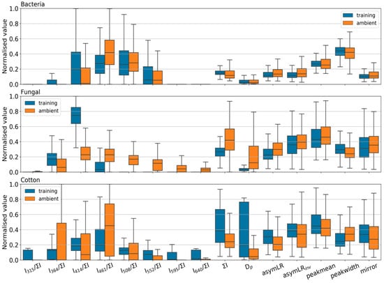 Comparison of training (blue) and ambient (orange) parameter distributions for each class. Top: Bacteria-like; Middle: fungal-like; Bottom: Cotton-like. Fluorescent spectra have been normalised by the total fluorescent intensity. All other parameters have been scaled to the maximum possible expected value. Whiskers denote 5th and 95th percentiles.