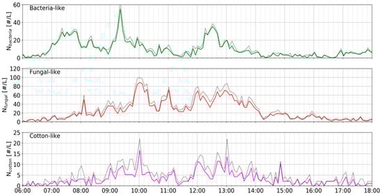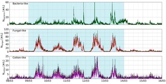 Figure 7 shows a time series of the integrated number concentrations for each class for the whole measurement period. Generally low background PBAP concentrations (a few per litre for all classes) are observed over the weekend when human activity inside University Place is low; weekdays display a consistent diurnal trend in the fungal-and cotton-like products, featuring a maximum around midday (approximately 80 L−1 and 10 L−1, respectively) which coincides with high activity inside the building as people use the catering facilities and enter and exit to attend lectures. Bacteria-like concentrations are elevated when compared to the weekend but the overall features of the weekday trends are less uniform. Several episodic bacterial events are observed with some major events occurring outside of the building public opening times. For example, Figure 8 shows a 12 h period from Friday the 13th of March which highlights this episodic behaviour; a relatively large and protracted bacteria-like event (~30 L−1) compared to background levels is observed between 7 and 8 AM, prior to any significant footfall inside the building. This then decays to near background levels before another, shorter-lived event (~55 L−1) is observed at around 9:30 AM. A final bacterial event (35 L−1) is observed at around 12:30 PM. Generally, these bacterial events do not correspond to enhancements in the fungal- and cotton-like classes.