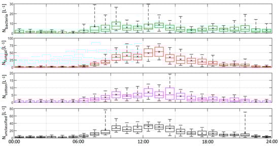 Weekday hourly averaged diurnal number concentrations. Top: Bacteria-like; 2nd row: fungal-like; 3rd row: cotton-like; bottom: unclassified. Whiskers denote 5th and 95th percentiles. Cross denotes mean value.