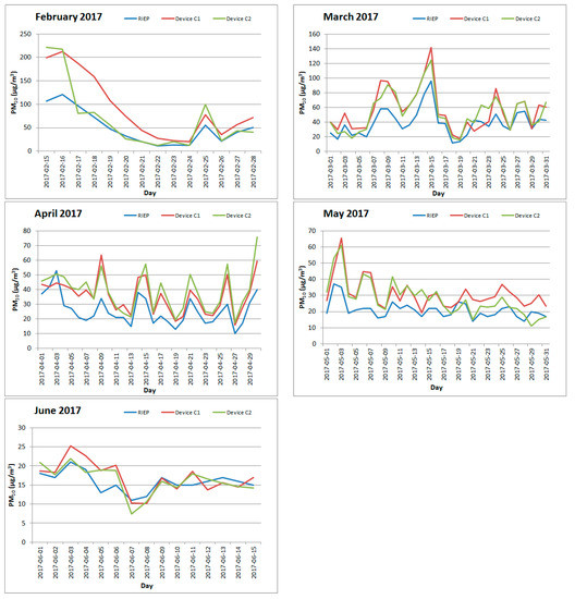 The comparative measurements of the two low-cost sensors (C1 and C2) with the reference instrument lasted through a period of varied conditions, in both meteorological and PM concentrations (Table 1, Table 2 and Table 3); that is the reason why the presented analysis was made for particular months (February–June 2017) separately. The graphical comparison of the raw measurements from the low-cost sensors and reference instrument (RIEP) can be found in Figure 2. The reference instrument measured only the PM10 fraction; therefore, the analysis omitted the remaining fractions measured by the low-cost sensors.
