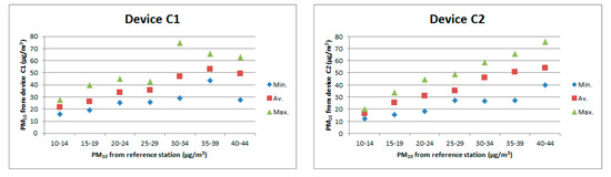 Figure 3 presents the relations between the measurement results (minimum, average, and maximum) from both the low-cost sensors and the reference instrument. The measurement range was divided into seven intervals, each of which covered 5 μg/m3. The minimum concentration of PM10 in the analyzed measurement period was 10 μg/m3, while 44 μg/m3 was assumed as the upper limit since only individual values (24-h averages) were recorded above it. Figure 3 does not include values that exceed these levels, so as not to impair the readability of the illustrations.