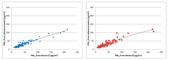 Figure 4. Regression curves for device C1 and C2 based on the raw PM10 measurements (24-h averages) from the low-cost sensors (February–June 2017, Rabka-Zdrój).