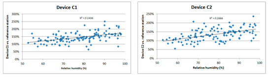 The results indicate that the degree of overestimation or underestimation of the PM10 measurements is related to some meteorological parameters. This phenomenon is particularly strong in case of relative humidity. Figure 5 shows the deviations in the measurement values from the two low-cost sensors compared to the reference instrument, depending on the relative humidity.