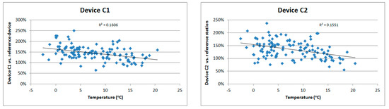 In the vast majority of cases, the tested sensors overestimated the measuring values. The measured concentrations were usually 30–50% higher than these from the reference instrument. Device C2 was characterized by a little higher stability, for which the concentrations in February, March, and May were on average 34–36% higher than in the case of the reference instrument. In April, the average measurement results were higher by 50%. For device C1, the measured values were on average 38–48% higher than these from the reference instrument. Much higher values were obtained only in February—over 80%. It turns out that the reason for this much larger deviation, compared to the remaining months, are the days in the period 15–20 February, when the sensor indicated values twice higher than the reference instrument.