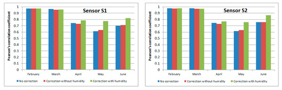 Figure 7. Correlation coefficient values for sensors S1 and S2 in particular months, with and without the correction applied (February–June 2018, Nowy Sącz).