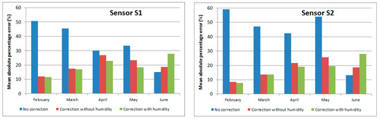 Figure 8. Mean absolute percentage errors for sensors S1 and S2 in particular months, with and without the correction applied (February–June 2018, Nowy Sącz).
