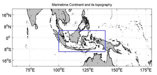 The terrain of the Maritime Continent (blue rectangle) and adjacent areas.