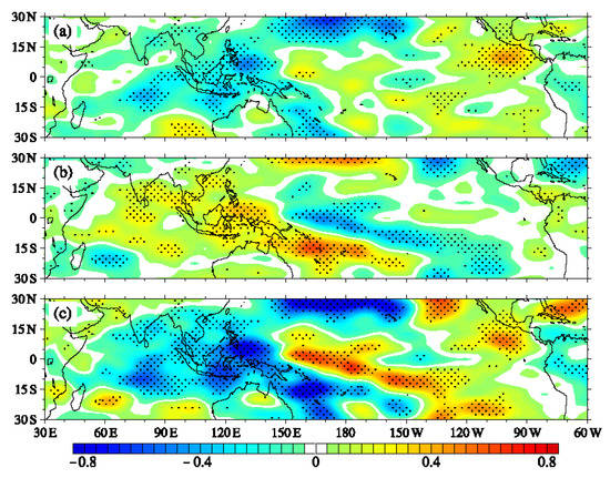 Correlation coefficients of the winter MC–MJO index with the autumn (a) SAMI (surface PIOAM associated mode index), (b) CTI (Cold Tongue ENSO index), and (c) WPI (Warm Pool ENSO index).