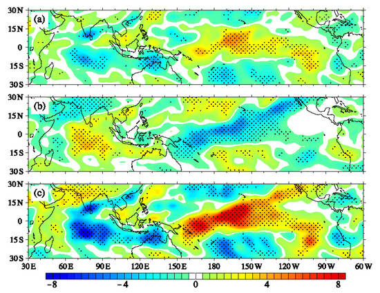 The intraseasonal oscillation (ISO) dominates the intraseasonal variability in the tropical atmosphere. The ISO near the equator is also called Madden–Julian Oscillation (MJO) [14,15]. It is a planetary-scale circulation anomaly coupled with convection, and it exhibits significant interannual and interdecadal variations [16]. Many studies have indicated that the MJO has direct relationships with the monthly and seasonal climate variables such as [17,18,19,20,21,22] and has significant impacts on the weather and climate around the world [23,24] such as the precipitation anomalies in many regions [25,26]; the activity of tropical cyclones [27,28]; the onset, break and retreat of the Asian summer monsoon [29]; and the evolution of El Niño events [30,31,32]. Thus, it is the bridge connecting weather and climate variations [23]. MJO convection always initiates in the western equatorial Indian Ocean, then propagates eastward into the Pacific along the equator, and finally weakens and dies out near the dateline [33]. MJO activity mainly occurs over the Indo-Pacific warm pool regions. Therefore, SSTA over the Indian and Pacific oceans (e.g., the ENSO and the IOD) play an important role in the variability of MJO.