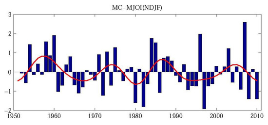 Yearly MC–MJO kinetic energy index in winter (bar). Results after nine point low pass filter are given in the red dashed line.