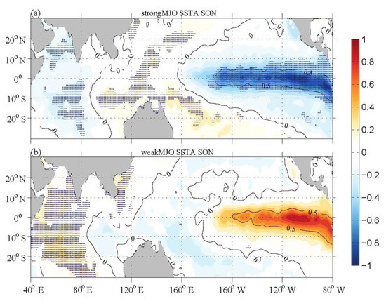 Composite distribution of SST anomalies (°C) in autumn during the (a) strong and (b) weak MC–MJO cases. Results passing the significance test at the 90% confidence level are stippled.