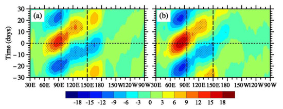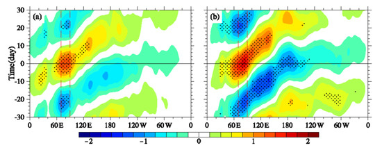Longitude-time diagram of the MJO zonal winds at 850 hPa averaged over the 10° S–10° N lag regressed onto that averaged over the 10° S–10° N, 70°–90° E during the (a) positive and (b) negative phases of PIOAM. Results passing the significance test at the 90% confidence level are stippled.
