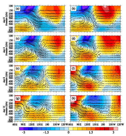 MJO zonal vertical circulation (vectors, magnified 500 times in the vertical direction, colors represent zonal velocity) lag regressed onto the MC–MJO OLR index during the positive (left row) and negative (right row) phases of PIOAM, day 0 positive (a) and negative (b), day 4 positive (c) and negative (d), day 8 positive (e) and negative (f), and day 12 positive (g) and negative (h).