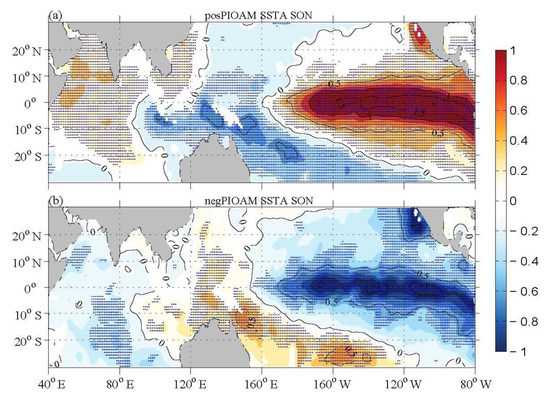 Composite sea surface temperature anomalies (SSTA) (°C) in autumn during the (a) positive and (b) negative phases of PIOAM.