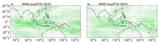 Composite horizontal wind field at 850 hPa (m·s−1) in winter (November to February in the following year) during (a) positive and (b) negative phases of PIOAM.