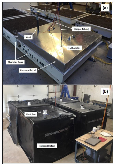 Manure that accumulated during a typical 150 day finishing period was scraped from a pen at a commercial feedyard in the Texas Panhandle and transported to the United States Department of Agriculture–Agricultural Research Service (USDA–ARS) Conservation and Production Research Laboratory in Bushland, TX. The manure was a mixture of unconsolidated, loose surface manure and deeper packed manure from cattle fed a steam–flaked corn–based diet. Selected physicochemical parameters of the manure were as follows: 91% dry matter (DM); 55% OM; 341 mg NHx·kg−1; 5.7 mg NOx·kg−1; 2.6% total nitrogen (TN); 27.7% total carbon (TC); C:N ratio of 10.8. The manure was roughly ground (<0.64 mm) with a 15–HP, 420 cc chipper/shredder (Stanley Black & Decker, New Britain, CT, USA). Manure (109 mm depth) was added to each of five 1 m2 (surface area) chambers (Figure 2a). Compacted native caliche (calcium carbonate soil; 89 mm) underlaid the manure in each chamber to simulate the relatively impermeable soil–manure interface under regional soil–surfaced feedyard pens [26,27]. The manure was compacted to an approximate dry bulk density of 0.61 g·cm−3 with a handheld tamper. The experimental period was 59 days in length and occurred in winter and spring of 2017. Chamber temperatures were controlled with 1.3 × 1.3 × 1.3 m “hotbox” material warmers (Model HB64–1440, Powerblanket, Salt Lake City, UT, USA) with digital temperature controllers and 12 V exhaust fans for venting (Figure 2b). In addition, silicone heating pads with digital temperature controllers (ProTherm Industries, Inc., Hermitage, TN, USA) were bonded to the bottom of each chamber. A single chamber (Chamber 1) did not have thermal regulation and was exposed to ambient temperatures, which varied diurnally and seasonally in an indoor facility without temperature control.