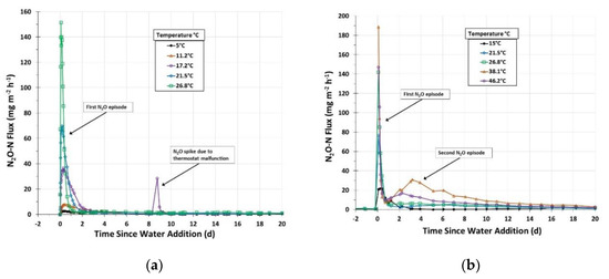 At higher temperatures (≥38 °C), a second N2O episode occurred ~3 days after H2O addition (Figure 3b). This emission peak was shorter in height (0.06 to 35 mg N2O–N·m−2·h−1) than the first episode, but had a longer duration (~2 weeks) and was stimulated by higher temperatures to produce a N2O flush that was greater in both magnitude and duration than the initial N2O peak after wetting. A second emission peak was also observed at 31 °C in an earlier work by Parker et al. [1], who used the same methodologies as the current study. Emissions of N2O during the second episode began ~24 h after H2O application and peaked after 3 days. The absence of the second peak from most chambers at lower temperatures (Figure 3a) was likely due to suboptimal conditions for OM mineralization and microbial/enzymatic processes related to N2O production. A thermostat malfunction occurred in Chamber 3, where the temperature increased to 45 °C for 6 h at 9 days after H2O application, causing a brief spike in emissions and providing further evidence for temperature effects on N2O from feedyards. At higher temperatures, the majority of N2O was derived from the second peak, accounting for 80–89% of cumulative emissions (Figure 3b). These results suggest that maximum cumulative feedyard N2O emissions should occur in warm/hot seasons around a week after a rainfall event; brief, but intense, flushes of N2O occur immediately after rainfall and emit more N2O at higher temperatures.