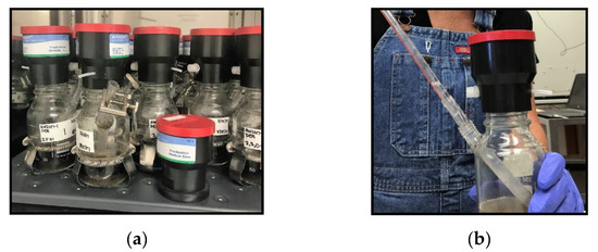 Denitrifier enzyme activity was determined according to Woodbury et al. [11] and Ayadi et al. [12]. In brief, 10 g (DM) of each triplicate sample was placed in 250 mL Ankom bottles with sealable sidearm ports (Ankom Technology, Macedon, NY, USA). A solution (90 mL) of 0.5 g·L−1 chloramphenicol, 5 mM glucose, and 10 mM potassium nitrate (KNO3) was added to each bottle, swirled to mix, and flushed with argon to create anaerobic conditions. The bottles were quickly capped with Ankom RF1 Gas Production Modules programmed to an Ankom Base Coordinator to release headspace gas (Figure 4a). The bottles were shaken at 21 °C for 54 h at 180 rpm. Liquid samples (1.0 mL) were collected with a thin pipette through the bottle side ports at 0, 2, 4, 6, 24, 48, and 54 h (Figure 4b), placed in 1.5 mL microcentrifuge tubes, flash–frozen in dry ice/ethanol, and stored at −80 °C. Samples were then analyzed for NOx as previously described. Rates of DEA were calculated with linear regression of NOx loss over time according to Ayadi et al. [12]. However, graphs of the data showed that a linear fit for the entire 54 h period was not ideal: R2 values ranged from 0.682–0.991. A bimodal data trend indicated there was either (1) more than one mechanism of NOx transformation occurring, or (2) a lag in enzyme activation (Figure 5). To accommodate for the different DEA rates over time, linear regression was used to calculate rates for DEA–short (DEAs) from 0–24 h incubations and DEA–long (DEAl) from 24–54 h incubations. Although linear regression did not always produce the best model fit for DEAl data, this method was selected to ease comparison with other DEA rates because of high variability in the patterns of DEAl rates over time.