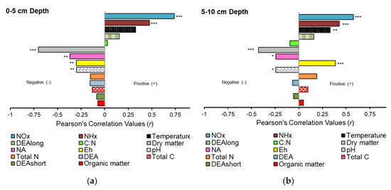 Pearson correlation coefficients (r values) of measured variables against nitrous oxide (N2O) emissions at (a) 0–5 cm depth and (b) 5–10 cm depth. Bars to the right of the y–axis indicate a positive (+) relationship and bars to the left are negatively (−) correlated. Asterisks indicate significant relationships at * p ≤ 0.05, ** p ≤ 0.01, *** p ≤ 0.001.