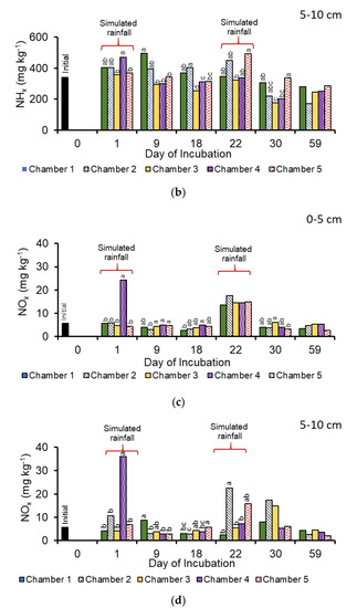 Concentrations of ammonia/ammonium (NHx) and nitrate/nitrite (NOx) during the study period in the five chambers at 0–5 cm and 5–10 cm depths. Columns with different superscript letters on each day were significantly different at p < 0.05. (a) NHx at 0–5 cm, (b) NHx at 5–10 cm, (c) NOx at 0–5 cm, (d) NOx at 5–10 cm.