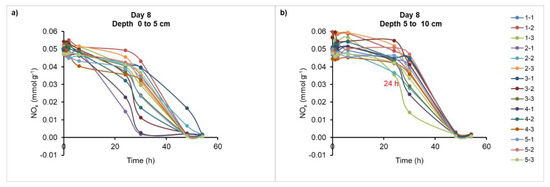 Example plots of nitrate/nitrite (NOx) disappearance over 54 h of anaerobic incubation for denitrification enzyme activity (DEA) studies in manure from (a) 0–5 cm depth and (b) 5–10 cm depth. These data were used to calculate DEA rates.