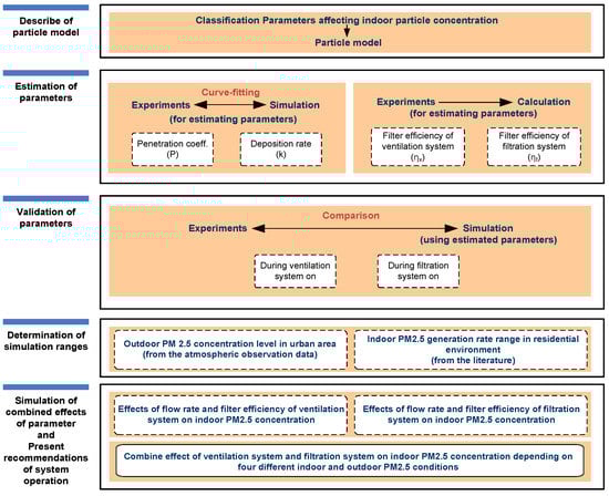 Simulations were carried out using a particle model in order to analyze the combined effects of ventilation and filtration control parameters on indoor PM2.5 concentrations in residential buildings. The research process of Figure 1 is as follows: