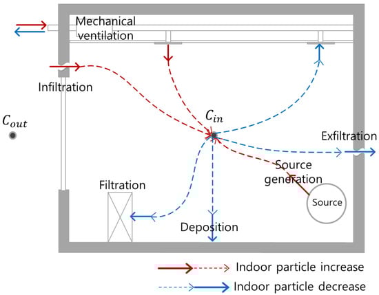 Since people spend most of their time indoors, indoor particle concentrations need to be managed below acceptable levels to minimize exposure to particle pollutants. Several studies evaluated parameters that affect indoor PM level and potential control strategies. Fisk et al. [7] evaluated indoor-fine-particle concentration depending on filter efficiency. Howard–Reed et al. [8] analyzed the effect of ventilation and filtration on indoor particle concentration reduction under different indoor generation conditions and concluded that filtering with an air cleaner reduces indoor particle concentration more effectively than ventilation does. Jamriska et al. [9] analyzed the impact of the ventilation rate on indoor PM concentration according to four different indoor and outdoor conditions: (1) high outdoor and low indoor concentration, (2) high outdoor and high indoor concentration, (3) low outdoor and high indoor concentration, and (4) low outdoor and low indoor concentration. Ben-David and Waring [10] reported that an outdoor air economizer and filter efficiency could greatly impact indoor PM2.5 concentration.