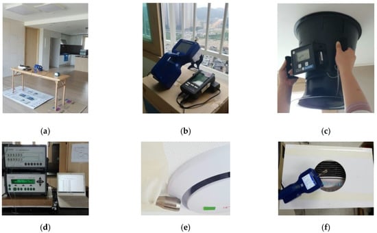 Measurement of (a) indoor particle concentration, (b) outdoor–particle concentration, (c) ventilation flow rate, (d) air exchange rate, (e) particle concentration on outlet side of ventilation system, and (f) particle concentration on outlet side of filtration system.