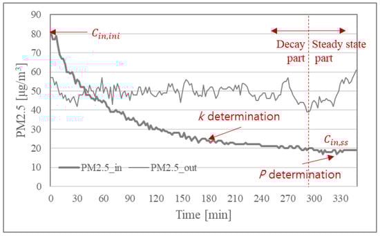 The deposition rate was determined using data showing the decay curve after the indoor PM2.5 concentration rose significantly above the normal concentration, and the penetration coefficient was determined using data when the indoor PM2.5 concentration reached equilibrium, as shown in Figure 4. Assuming that P and k are constant, that the ventilation system, filtration system, and indoor generation are turned off, and considering that and are stable, the differential equation of Equation (1) can be solved by Equation (2), and PM2.5 concentration at equilibrium can be presented by Equation (3). By taking natural logarithm on both sides of Equation (2), Equation (4) can be obtained.