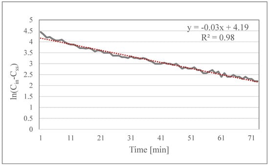 In the graph of Equation (4) shown in Figure 5, the slope of the fitting line represents decay rate, the sum of and k. The deposition rate was calculated by subtracting (simultaneous measurement) from the decay rate, and then, using k, the penetration coefficient was obtained using Equation (3). It should be noticed that the slop of Figure 5 is expressed in min−1 and it should be converted into h−1. A total of eight identical sets of experiments were carried out to obtain coefficients P and k, and results are given in Table 3. The arithmetic mean values (p = 0.7 and k = 0.4) of data were applied to the simulation model. These values were within the valid range compared to other studies [21,22,23,24,25,26,27].