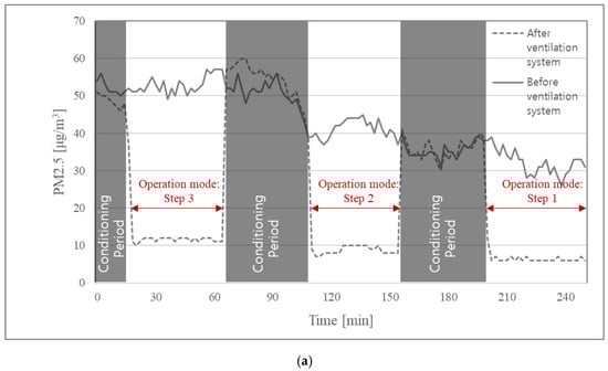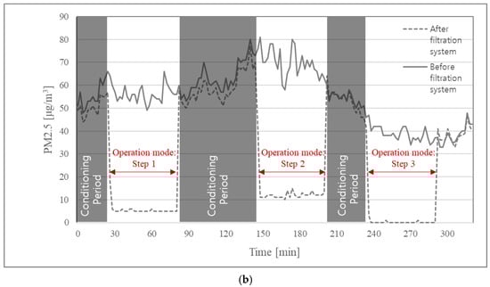To obtain the filter removal efficiency of the ventilation system, , outdoor concentration and the concentration of discharged air from the diffuser (shown in Figure 3e) were measured, and the ratio of removed and incoming particle concentrations was calculated using Equation (5). The removal efficiency of air cleaning system was also estimated in the same manner as by using measured particle concentration of incoming and discharge air of the filtration system (shown in Figure 3f). Since filter efficiency is affected by air velocity passing through the filters, experiments were conducted under the condition of three different air-flow rates as shown in Figure 6, and results are shown in Table 4.