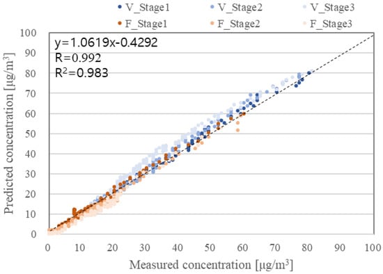 Validation tests were carried out for six days to ensure the conformity of the obtained coefficients. Experiments were carried out in the same way as the coefficient experiments except that the ventilation system or portable air cleaner was operated during the measurement. Previously obtained coefficients (, , , ) and filtration air-flow rates () were used for the inputs of the model as listed in Table 5, and the air-flow rate of the ventilation system () was estimated by subtracting infiltration rate from the measured air exchange rate (ACH). Here, the infiltration rate was assumed to be 0.13 h−1. This was the average value during 14 days of parameter obtaining experiments (shown in Table 3). A recent study showed that ACH in 36 new apartments in Korea ranged from 0.12 h−1 to 0.24 h−1 [33], while another study found that the average ACH was 0.08 h−1 in summer and autumn and 0.12 h−1 in winter and spring [24]. Experiments were conducted with different flow rates of ventilation or filtration system, and the comparison of measured and predicted data is shown in Figure 7. Indoor PM model revealed high performance with R2 = 0.988.