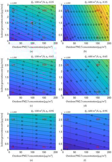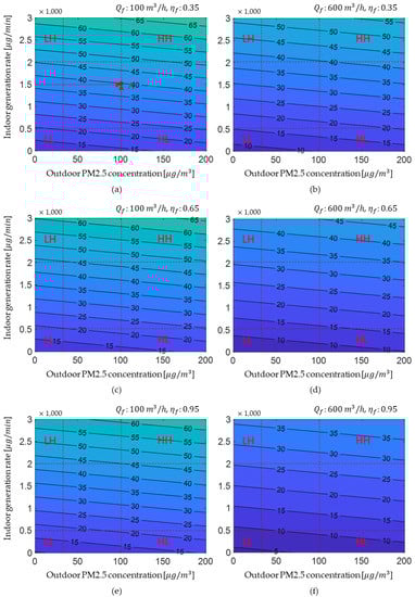 The combined effects of ventilation air-flow rate and filter efficiency on indoor PM2.5 concentration depending on outdoor PM2.5 concentration (X axis) and indoor PM2.5 generation rate (Y axis) are simulated using MATLAB program. Figure 8 shows the indoor PM2.5 characteristics when ventilation flow rate is 100 m3/h or 600 m3/h and ventilation filter efficiency is 0.35, 0.65, or 0.95. The LL condition on each graph indicates the low outdoor PM2.5 concentrations range (below 30 ) and low indoor PM2.5 generation rates range (below 500 μg/min), the HL condition indicates the high outdoor PM2.5 concentration range (above 100 ) and low indoor PM2.5 generation rate range (below 500 μg/min), the LH condition indicates the low outdoor PM2.5 concentration range (below 30 ) and high indoor PM2.5 generation rate range (above 2000 μg/min), and the HH condition indicates the high outdoor PM2.5 concentration range (above 100 ) and high indoor PM2.5 generation rate range (above 2000 μg/min). Point A in Figure 8a represents indoor PM2.5 concentration (47 μg/m3) after 30 min of ventilation control with an air-flow rate of 100 m3/h and filter efficiency of 0.35 when outdoor PM2.5 concentration was 100(x value) and indoor PM2.5 generation rate was 1500 (y value). It should be noticed that indoor PM2.5 concentrations shown in Figure 8 are not steady-state concentrations. To compare indoor concentration of the early control stage by control case, the indoor concentration was analyzed 30 min after the application of control. It can be observed that the indoor PM2.5 concentration graph had a different slope and spacing (intervals between concentration lines drawn every 5 ) for each case. If the contribution of outdoor concentration to indoor PM2.5 concentration was high, the slope increased; if the contribution of indoor generation was high, the slope decreased. The wide spacing in the graph indicates that indoor concentration was effectively reduced by the corresponding control method. When ventilation flow rate was low (Figure 8a,c,e), the slope and spacing of the graph according to filter efficiency did not change much; however, in high–flow conditions such as 600 m3/h (Figure 8b,d,f), the slope of the graph decreased and the gap widened as filter efficiency increased.