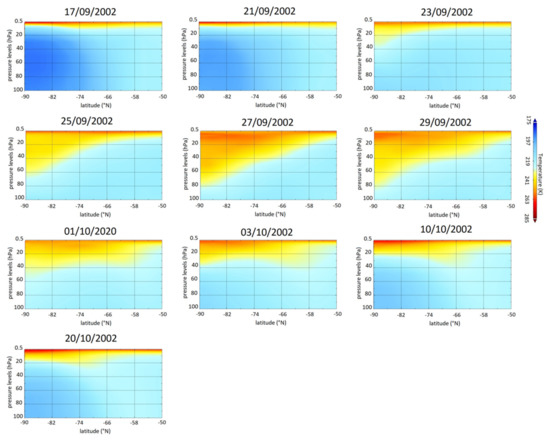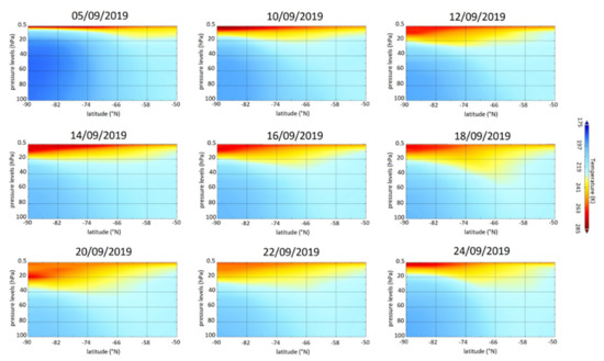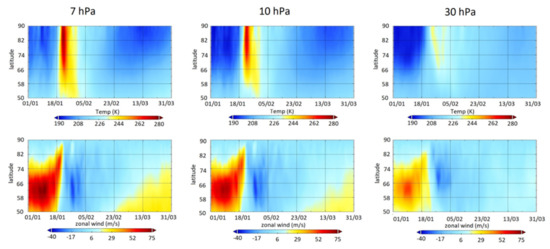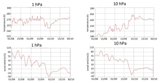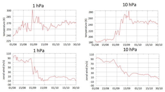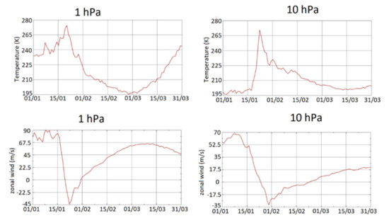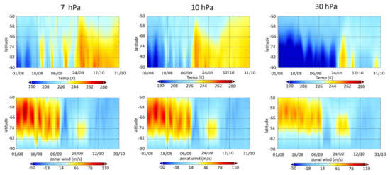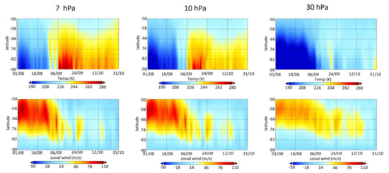 The following are available online at https://www.mdpi.com/2073-4433/11/10/1063/s1, Figure S1: Polar temperature at 90° S for 1 and 10 hPa (upper panels) and zonal mean of zonal wind at 60° S (bottom panels) for 1 and 10 hPa during 1 August 2015–30 October 2015, Figure S2: Polar temperature at 90° N for 1 and 10 hPa (upper panels) and zonal mean of zonal wind at 60° N (bottom panels) for 1 and 10 hPa during 1 January 2014–31 March 2014, Figure S3: Polar temperature at 90° N for 1 and 10 hPa (upper panels) and zonal mean of zonal wind at 60° N (bottom panels) for 1 and 10 hPa during 1 January 2020–31 March 2020, Figure S4: Zonal mean of temperature (upper panels) and zonal wind (bottom panels) for 7, 10, and 30 hPa during period 1 August 2015–30 October 2015, Figure S5: Zonal mean of temperature (upper panels) and zonal wind (bottom panels) for 7, 10, and 30 hPa during period 1 January 2014–31 March 2014, Figure S6: Zonal mean of temperature (upper panels) and zonal wind (bottom panels) for 7, 10, and 30 hPa during period 1 January 2020–31 March 2020.
