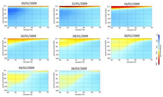 Vertical profile of polar temperature during sudden stratospheric warming (SSW) in 2009 in the Northern Hemisphere (NH).
