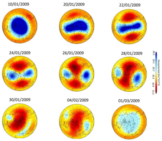 - Manney, G.L.; Schwartz, J.; Krüger, K.; Santee, M.L.; Pawson, S.; Lee, J.N.; Daffer, W.H.; Fuller, R.A.; Livesey, N.J. Aura Microwave Limb Sounder observations of dynamics and transport during the record-breaking 2009 Arctic stratospheric major warming. Geophys. Res. Lett. 2009, 36, L12815. [Google Scholar] [CrossRef]