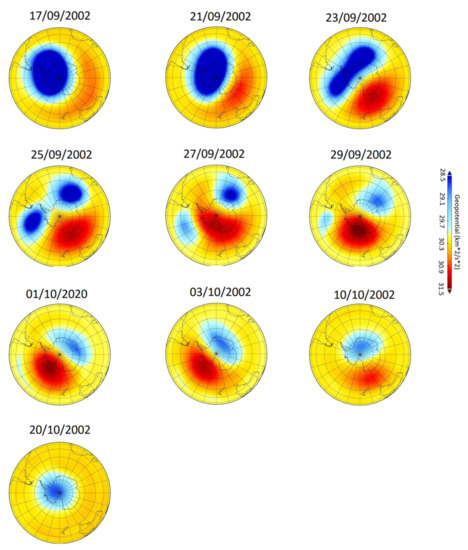 Figure 9 shows temperature vertical profile of major SSW in 2002 in the SH. It starts on 17 September 2002, when normal situation in stratosphere occurs. On 21 September we detected strong temperature increase but vertical profile remains of normal shape. However, during maximum of SSW on 29 September, the SSW penetrated down to 80 hPa. This was also the lowest level which is reached during this SSW and after that it began to normalize. The end of SSW was in mid-October. Here we can see the difference between major SSW in 2009 and 2002. During maximum of SSW in 2009, substantial heating penetrated down to 200 hPa, while during the maximum of SSW in 2002, the warm part reached from 80 and possibly up to 100hPa (23 September–1 October), and the lowest part of stratosphere and the upper troposphere were not significantly affected. This finding is supported also by Figure 10, which shows geopotential at 10 hPa. On 17 September, the polar vortex was going to be disturbed and during the maximum was split into two cells. However, it was quickly restored and undisturbed situation is visible in mid-October. If we compare this behavior with SSW in 2009, the normal situation can be seen not earlier than at least one month after maximum of SSW. This can be explained by different dynamics on both hemispheres, where the SH planetary waves, which are mainly responsible for SSW, are not generated so easily in the lower part of the atmosphere (troposphere), while in the NH, these waves have several sources in the troposphere.