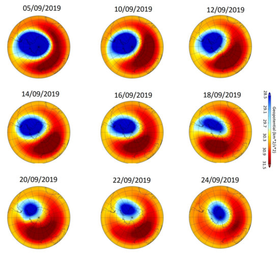 The last SSW we focus on is in September 2019 in the SH. This SSW is unusually strong as was mentioned before but it cannot be classified as a major SSW. Figure 11 shows vertical temperature profile. The SSW can propagate down to 40 hPa and its maximum was on 18 September. At the beginning and after maximum, it affects only the upper and middle stratosphere above and around 20 hPa. That is very different from major SSW in 2002, even though the temperature increase is much bigger. The feature can be observed on Figure 12, which displays geopotential at 10 hPa. We can see that polar vortex is displaced in maximum of SSW but still it remains near the pole and the restoration of situation is very quick (on 24 September we almost cannot see any difference from normal situation). So, we can only speculate what processes are responsible for this SSW.