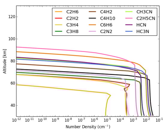 In the ice condensation studies (Figure 1, Figure 2, Figure 3 and Figure 4), gases are supplied as a flux at the model top boundary (to simulate transport into the model domain from phtochemical production at higher altitudes). Haze particles from the steady-state model serve as condensation nuclei, with a contact parameter calculated based on CH4, C2H6, and C4H10 lab measurements [,].