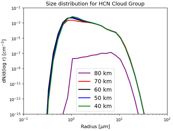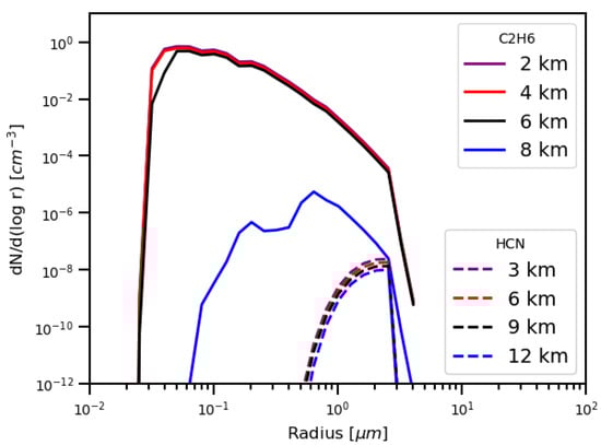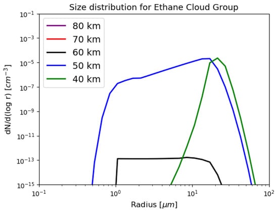 Size distributions at various altitudes of the ethane particles. The low volatility of the ethane vapor pressure at Titan’s stratospheric temperatures allows for efficient condensation growth of the ice particles (similar to methane).
