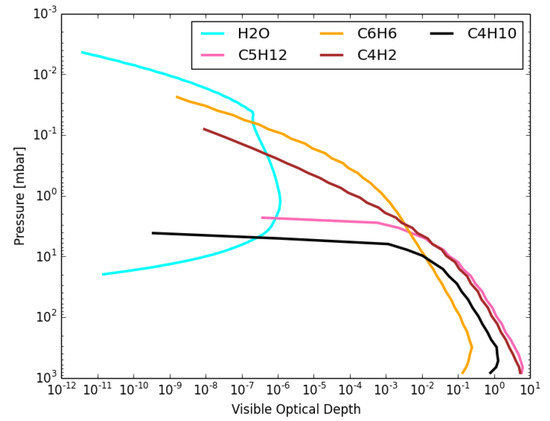 Geometric limit optical depth (per layer) of the ice particles formed in Saturn’s atmosphere. Water ice particles can form from either homogeneous nucleation or heterogeneous nucleation onto involatile haze particles. Both types of particles then serve as condensation nuclei for the trace hydrocarbons shown.