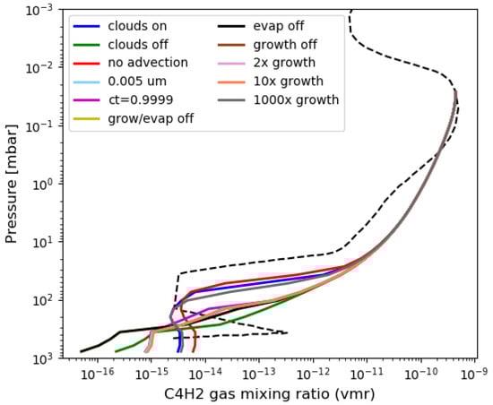 Sensitivity tests showing the effects of different microphysical processes on the C4H2 gas in Saturn’s atmosphere after the 2010 storm. The dashed curve shows the C4H2 volume mixing ratio modeled by [] for the aftermath of the storm in May 2011. C4H2 gas is created each timestep using a gaussian production function to simulate photochemistry. Loss occurs through cloud formation. The spike in C4H2 below 100 mbar is believed to be due to evaporation of C4H2 ice particles. This is consistent with microphysics modeling which shows the absence of any spike when the evaporation process is turned off (green—no cloud microphysics, black—no evaporation, yellow—no growth or evaporation). Other tests show how altering cloud parameters affects the amount of evaporated C4H2 such as changing the minimum radius of cloud particles from 0.1 µm to 0.005 µm, increasing the contact parameter for heterogeneous nucleation from 0.9991 to 0.9999 to make nucleation more efficient, and increasing the condensation rate. The modular structure of PlanetCARMA allows these parameters to be changed with minimal to no changes within the code.